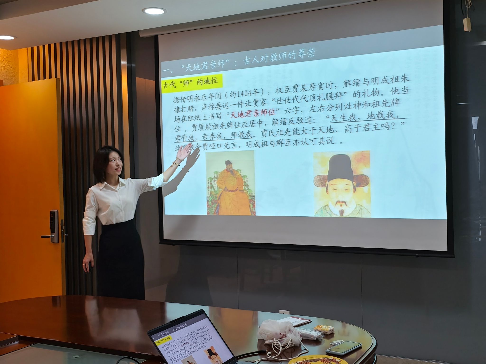 9月10日上午,宣讲团在太阳集团tyc539文汇楼会议厅举办教师节主题宣讲,王敬瑶主讲《薪火相传,师道永续》,30名学生参与。课程围绕师道传承,通过古今尊师行为与教师在国难时期的作用,深化学生对尊师重道内涵的理解。实践环节包括绘制教师形象、写信致谢等。宣讲团也为当天活动到场的同学精心准备了鲜花,让同学们在暖心的课程中将尊师重道的文化延续。