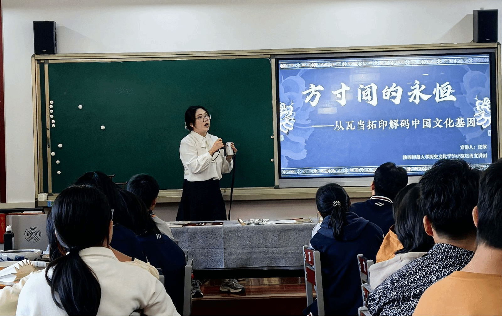 9月24日下午,我集团“史原星火”大学生理论宣讲团到西安市航天第一中学开展宣讲活动,由2023级任歆主讲《方寸间的永恒——从瓦当拓印解码中国文化基因》主题课程,西安市航天第一中学50余名学生参与。