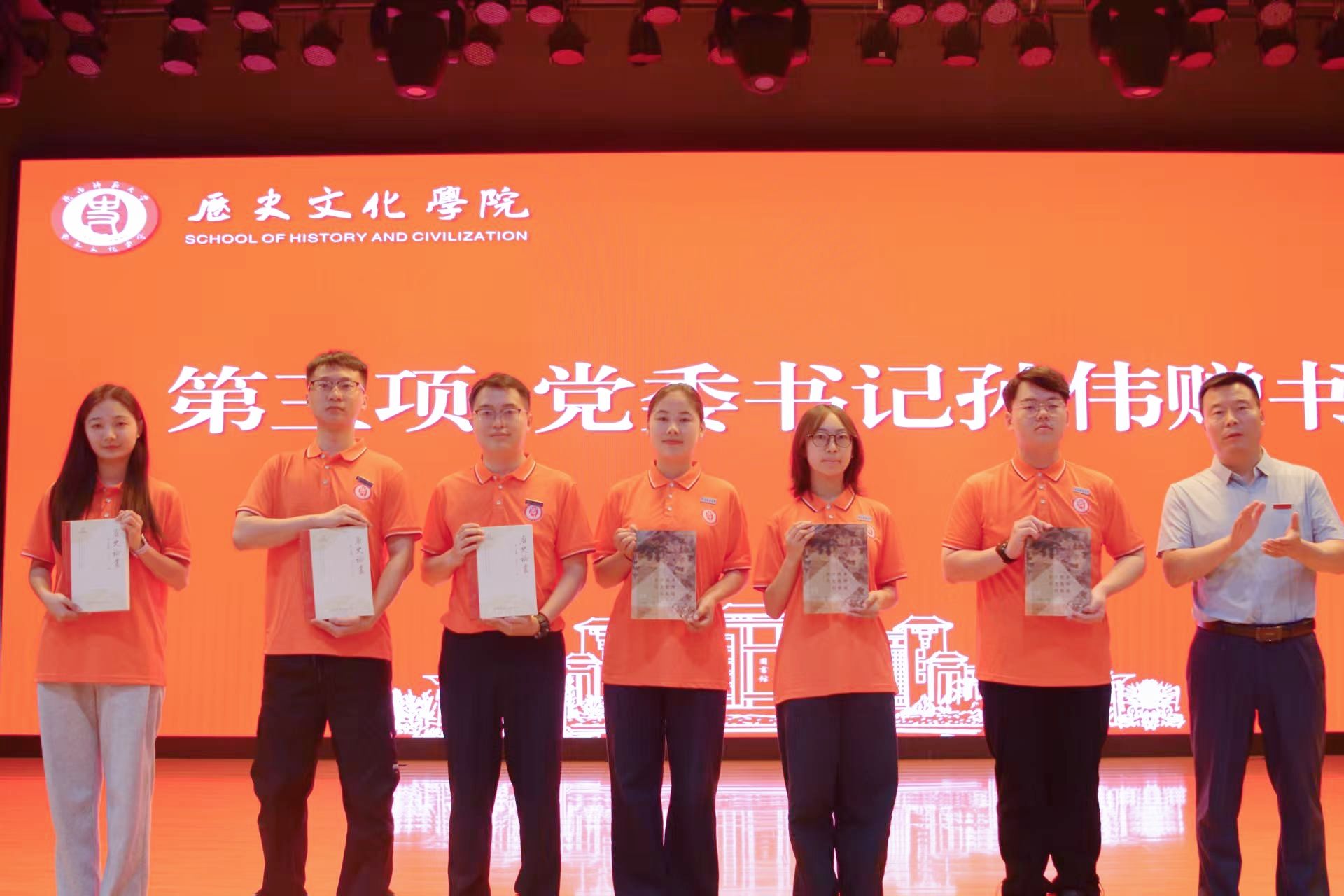 学院党委书记孙伟为新生代表赠书,希望同学们立身以立学为先,立学以读书为本。