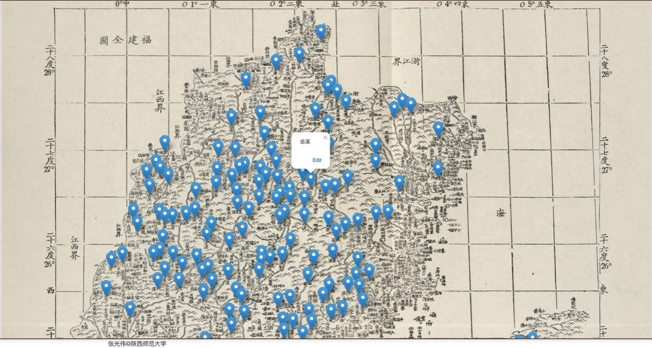 不仅是古籍,古地图的数字化也使新技术找到另一处大有可为的创新天地。通过OCR(光学字符识别)技术提取地名信息,使古地图等珍贵史料成为“活”起来的“可检索”“可分析”的文献知识库。例如在《康熙皇舆全览图》中检索“溪”字,福建省内相关地名密集显现,而“堡”字则在陕西、山西的地名中成群分布,这种地名用字的差异,背后蕴含着历史文化特征与自然地理特点。此外,古地图还实现了古代道路交通网络的可视化呈现。2023年以来,张光伟团队利用大模型技术,将古文献中的地名、道路与古地图精准对齐,为基于古地图的历史学研究提供了重要支撑。