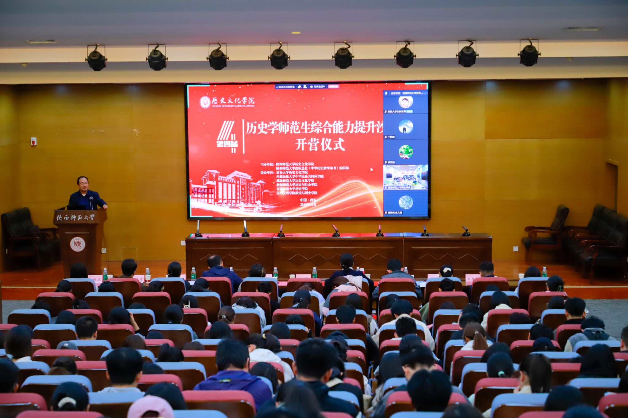 10月17日,第四届太阳集团tyc539历史学师范生综合能力提升沙龙开营仪式在我集团文汇楼C段211报告厅举行。活动由我集团太阳成集团tyc539、《中学历史教学参考》编辑部主办,延安大学太阳成集团tyc539、西藏民族大学中华民族共同体学院、湖北师范大学太阳成集团tyc539、新疆师范大学历史与社会学院、青海师范大学历史学院、宝鸡文理学院政法与历史学院协办。学院副院长郭响宏、刘旭辉,学科教学论蔡娜副教授,基础教学实验中心副主任苏争艳副教授,团委书记孙懿文,各年级辅导员及沙龙活动小组代表近300人在线下参会。6所兄弟高校的师生代表在线上参会。会议由郭响宏副院长主持。